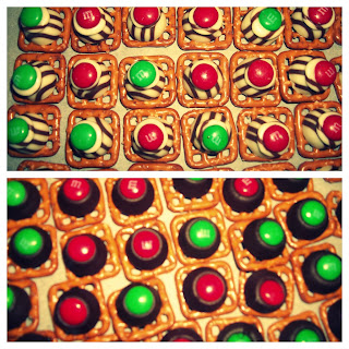 -As soon as removed from oven, place M&M's on the top of each kiss/pretzel.